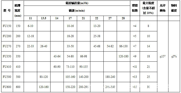 [1]FU 型鏈?zhǔn)捷斔蜋C的規(guī)格性能列入下表。表中列出了各機型在不同鏈速下的輸送能力范圍。同樣的輸送量可以在表中選到不同的機型,若選用較大機型則鏈速較低、磨損 小,但設(shè)備投資較高,若選用較小機型則鏈速較快,磨損相對較高,但設(shè)備投資較省。應(yīng)當(dāng)指出,當(dāng)實際輸送量達(dá)不到該機輸送能力的65%時,由于機槽內(nèi)物料層 過薄而造成輸送鏈空轉(zhuǎn),也會增加設(shè)備的磨損。因此,建議輸送機的實際輸送量不宜低于表一中輸送能力的小值,以實際輸送量乘以1.2以后,也不宜高于表中 輸送能力的大值。