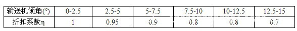 [2]當(dāng)輸送機傾斜向上運行布置時(即進(jìn)料端在下方,出料端在上方),其輸送能力將有所減少。此時輸送機的輸送能力應(yīng)按下表乘以折扣系數(shù)η: